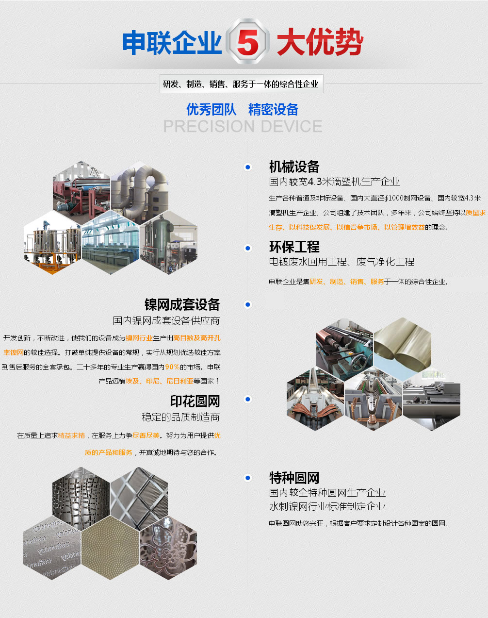 申聯(lián)企業(yè)是一家集機(jī)械設(shè)備、環(huán)保工程、鎳網(wǎng)生產(chǎn)成套設(shè)備、印染鎳網(wǎng)、特種鎳網(wǎng)等系列相關(guān)產(chǎn)品的研發(fā)、制造、銷(xiāo)售、售后服務(wù)于一體的綜合性企業(yè)。企業(yè)屬下有宜興申聯(lián)機(jī)械制造有限公司和宜興市申聯(lián)環(huán)保紡織器材廠有限公司。